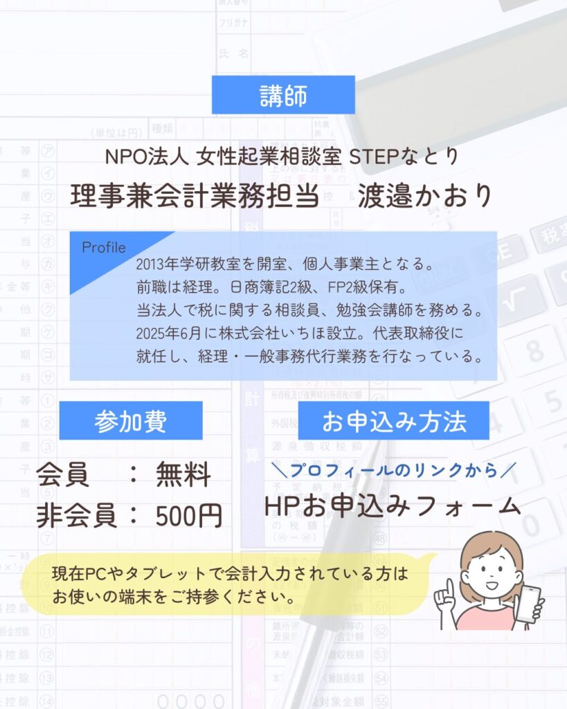 対象者 : 確定申告をしたことがない方、確定申告したことはあるが不安な方、開業届を出していないけれど起業している方、これから起業する方で確定申告方法を知りたい方