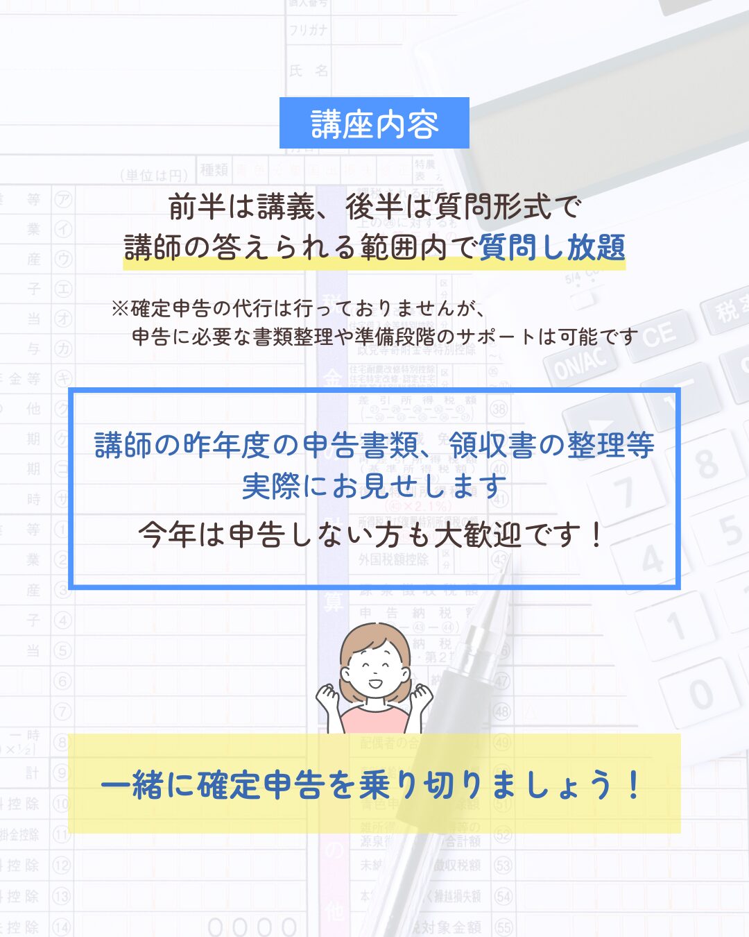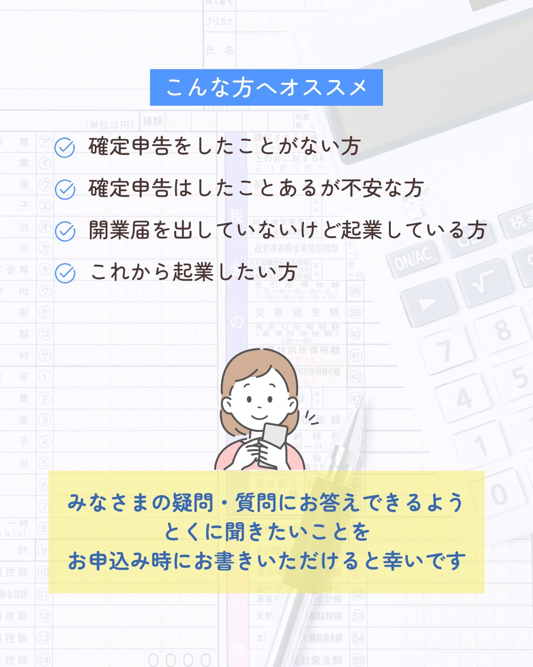 対象者 : 確定申告をしたことがない方、確定申告したことはあるが不安な方、開業届を出していないけれど起業している方、これから起業する方で確定申告方法を知りたい方